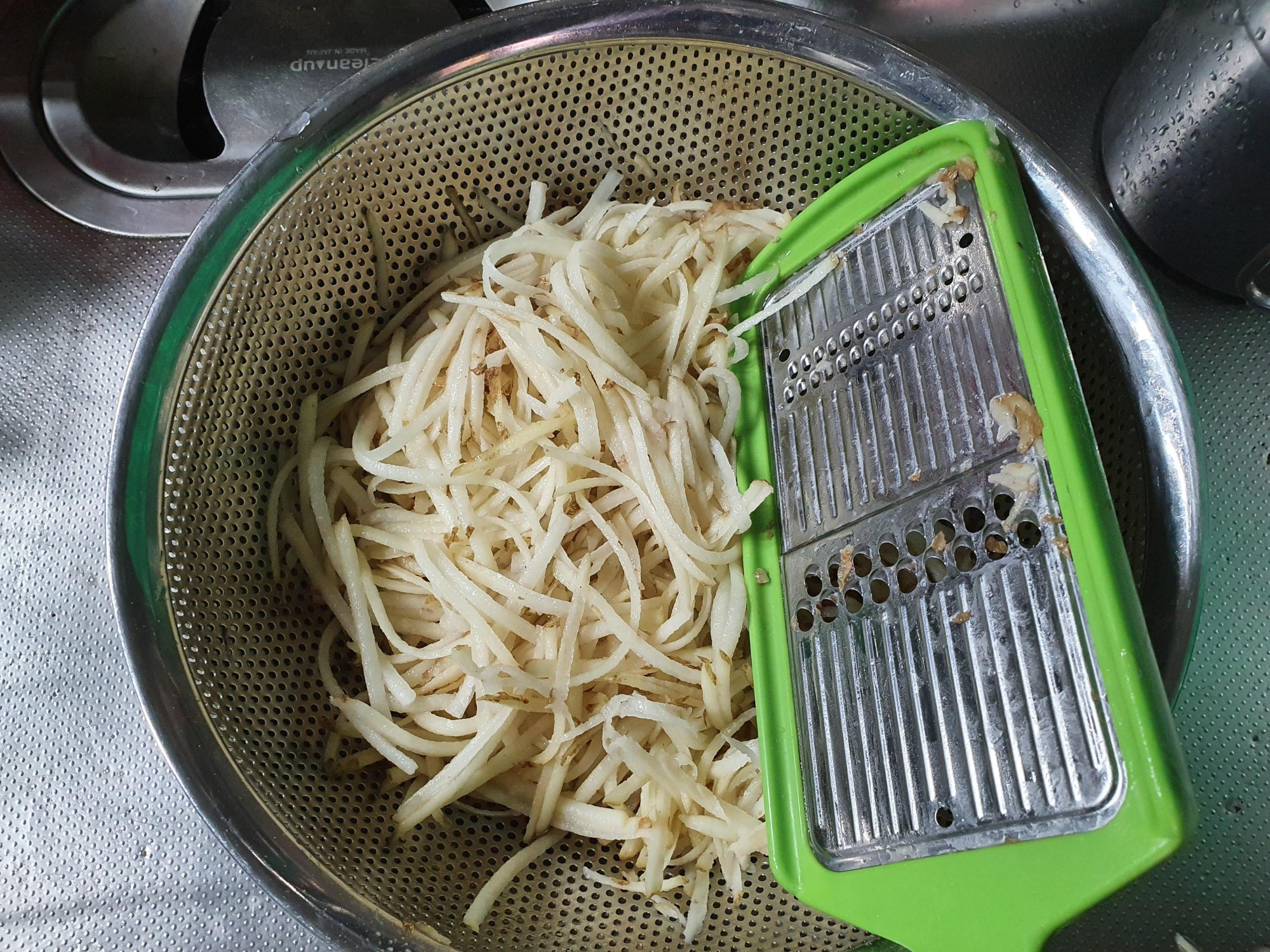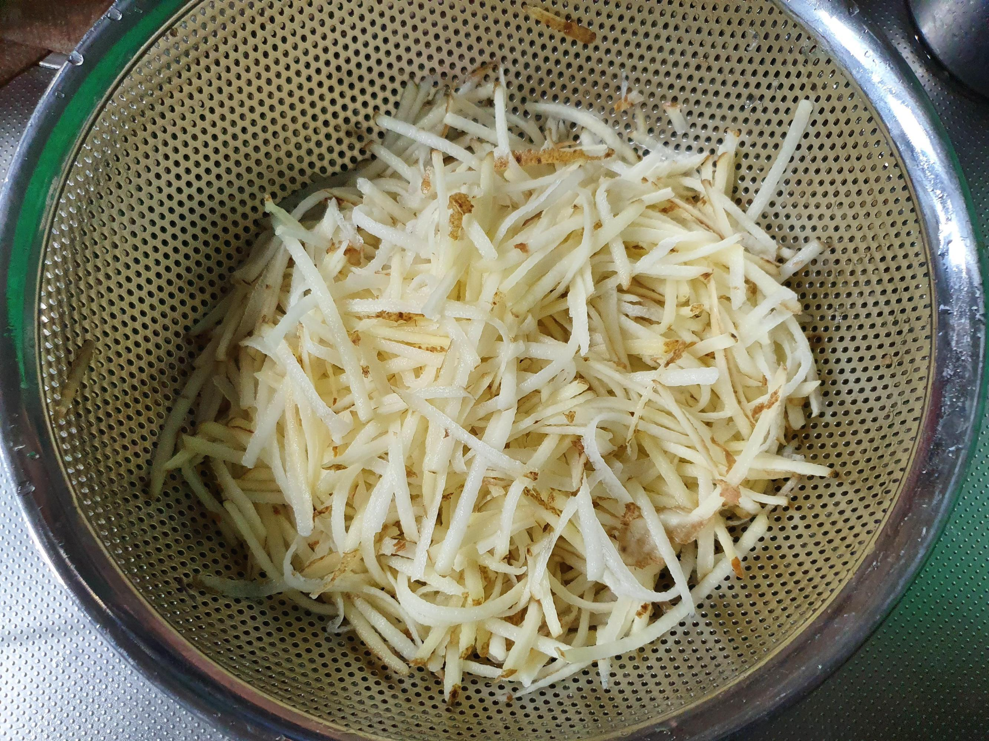 채 썬 감자를 물에 한 번 행궈서 녹말을 씻어냅니다.
