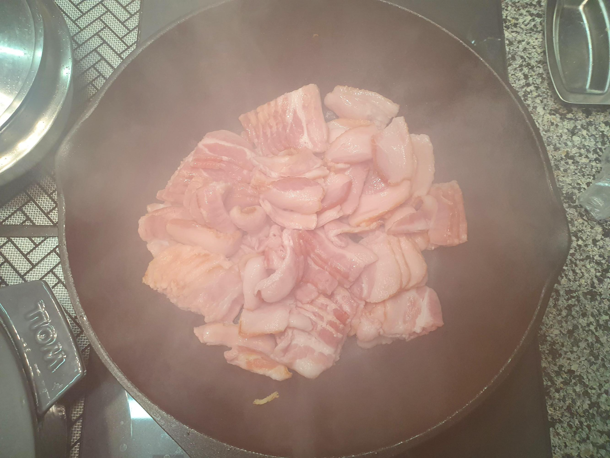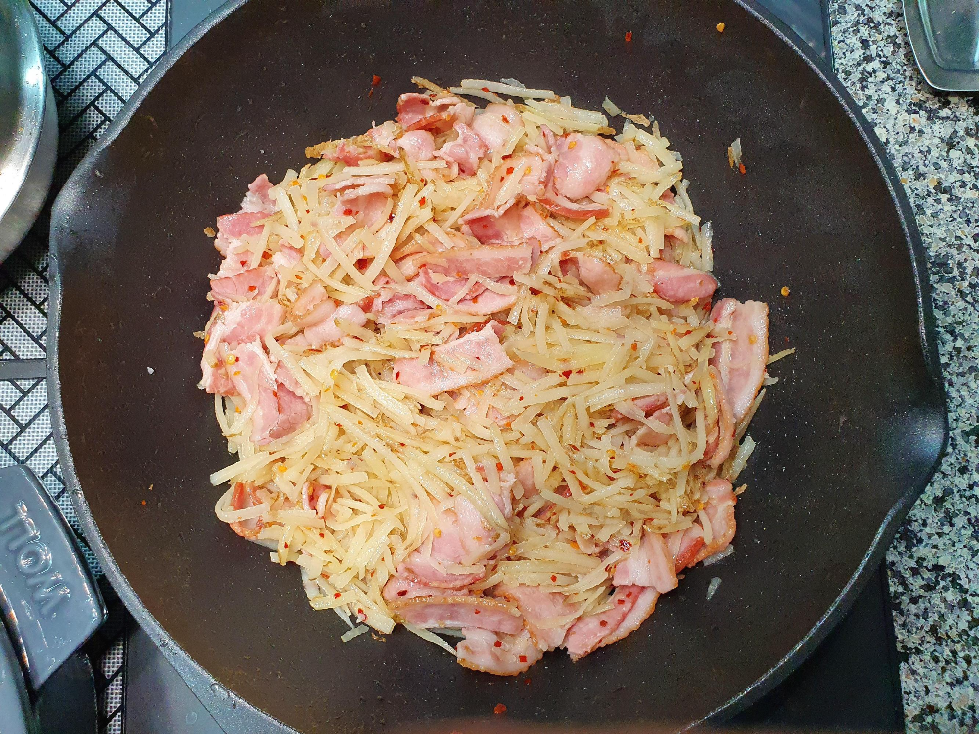 베이컨이 노릇해지면 먼저 볶아놓은 감자를 베이컨 위에 투입합니다.