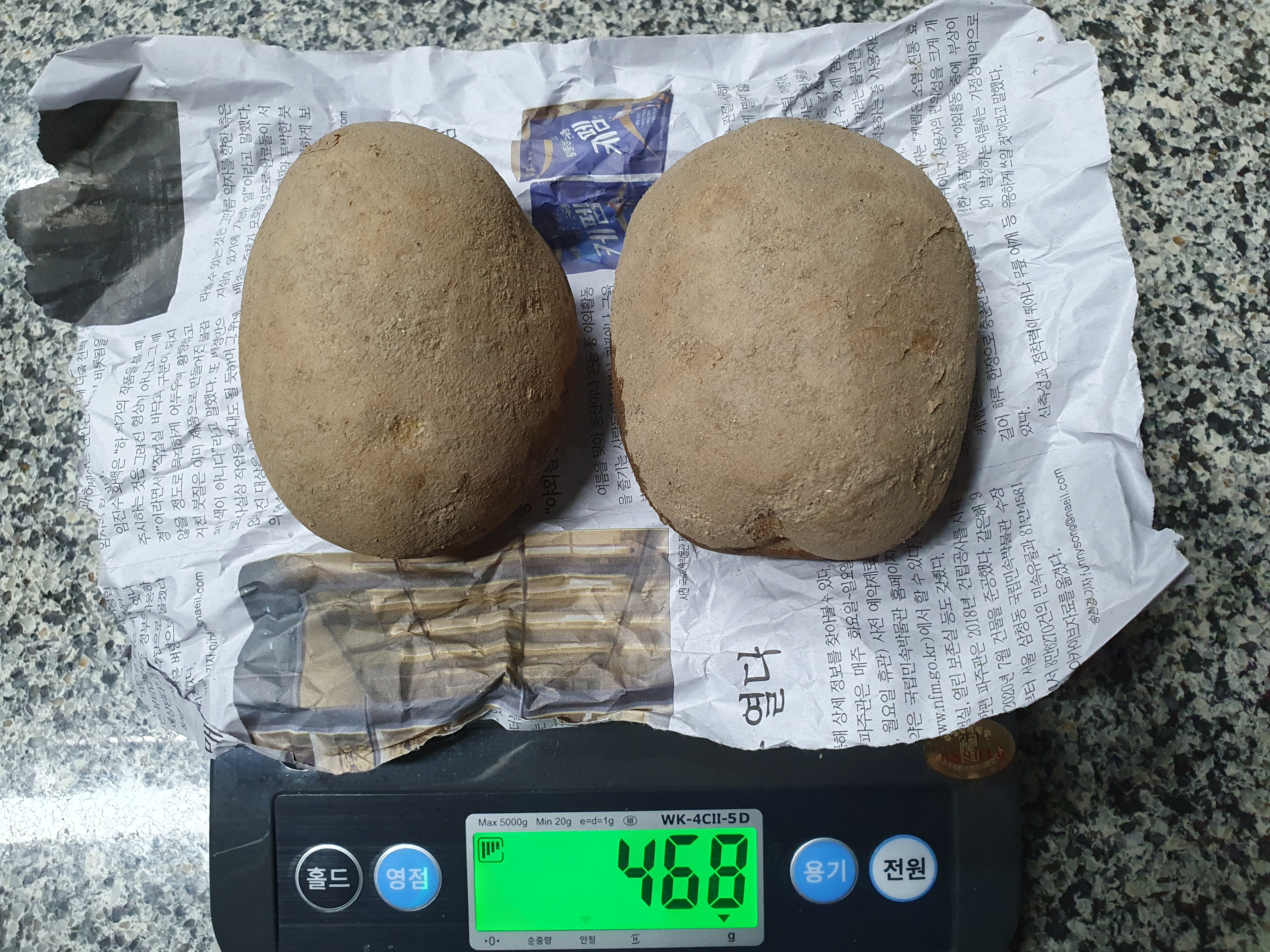 흙감자 2개를 꺼냈습니다. 무게를 달아보니 468g입니다.