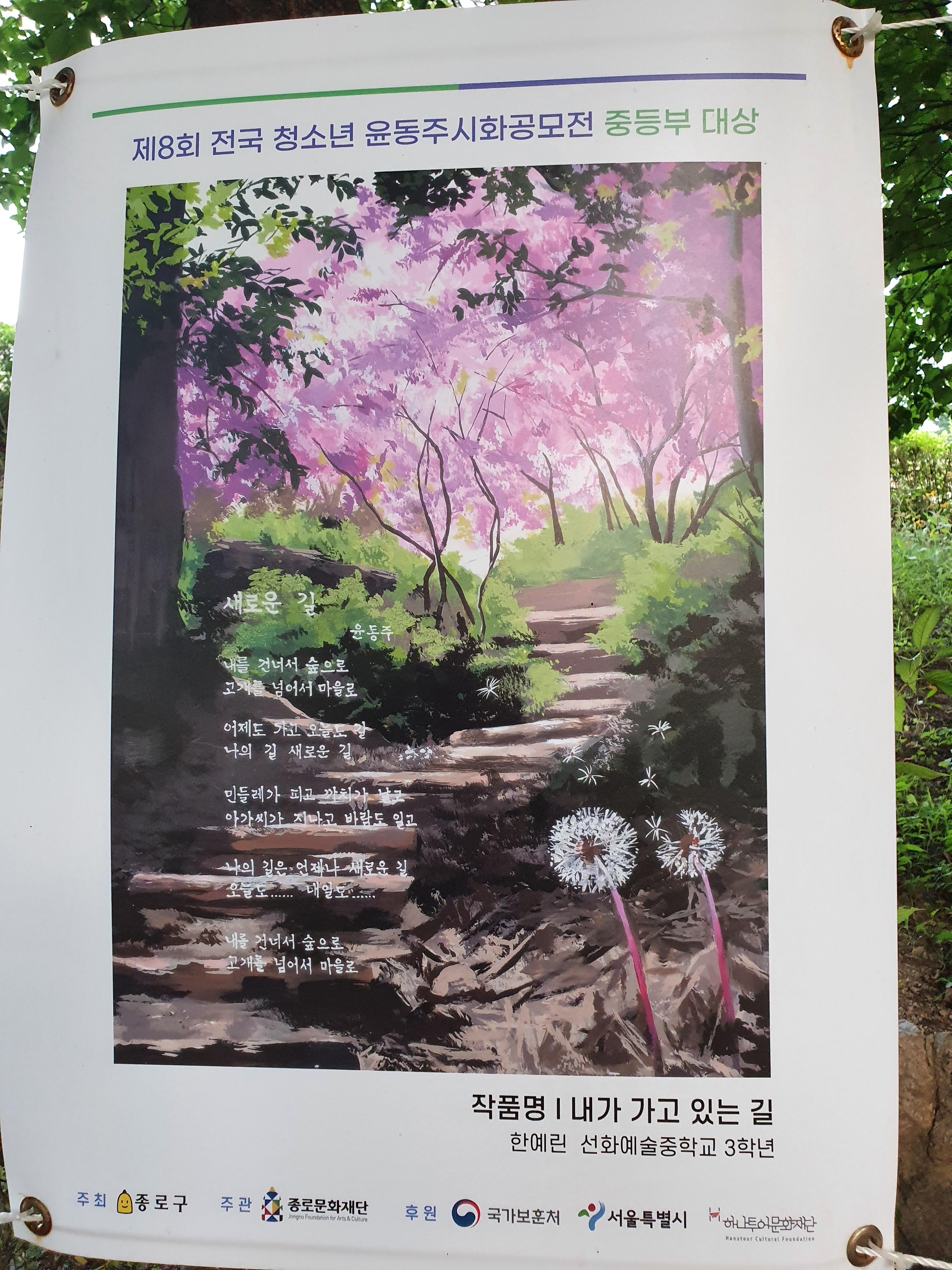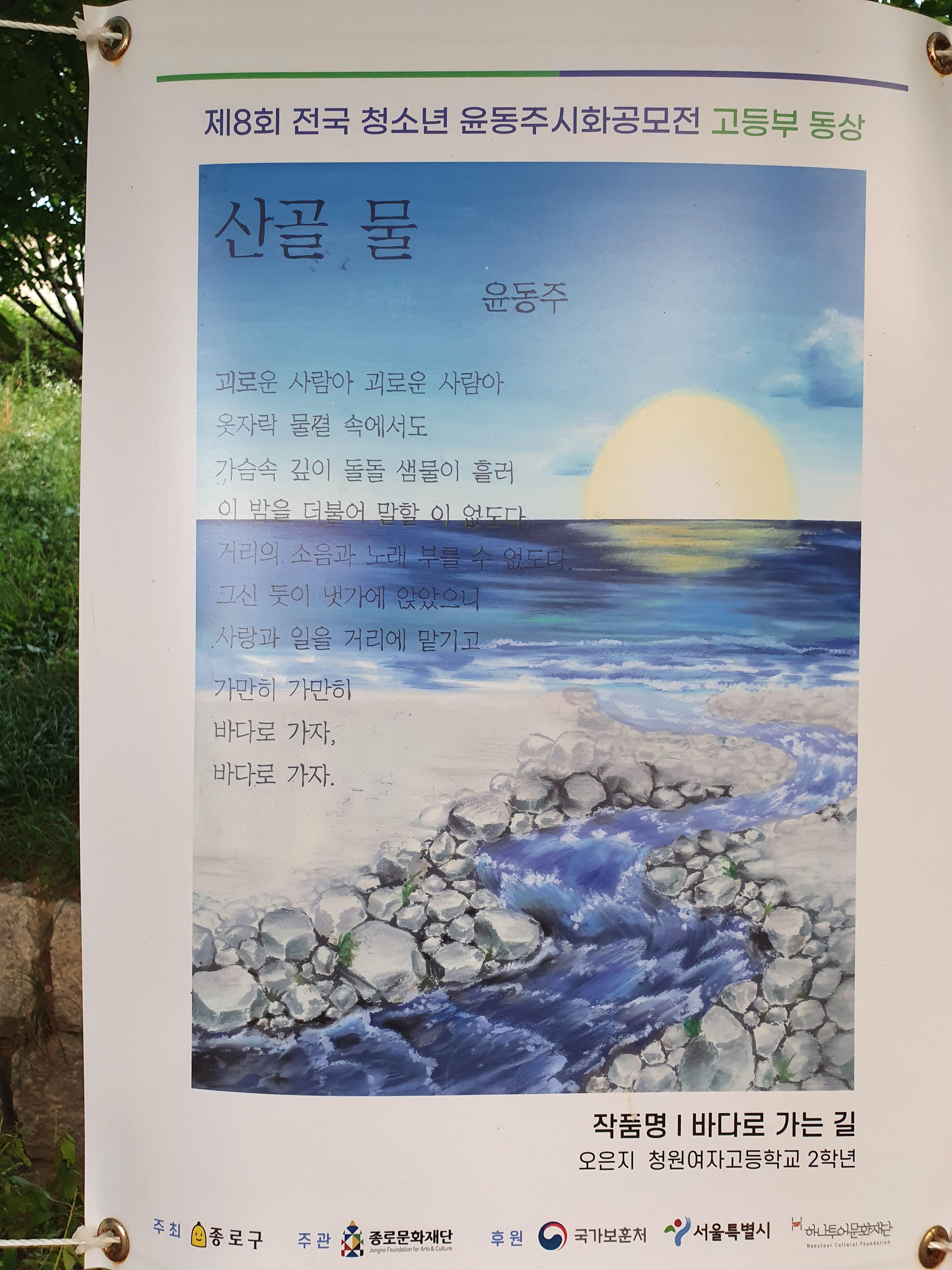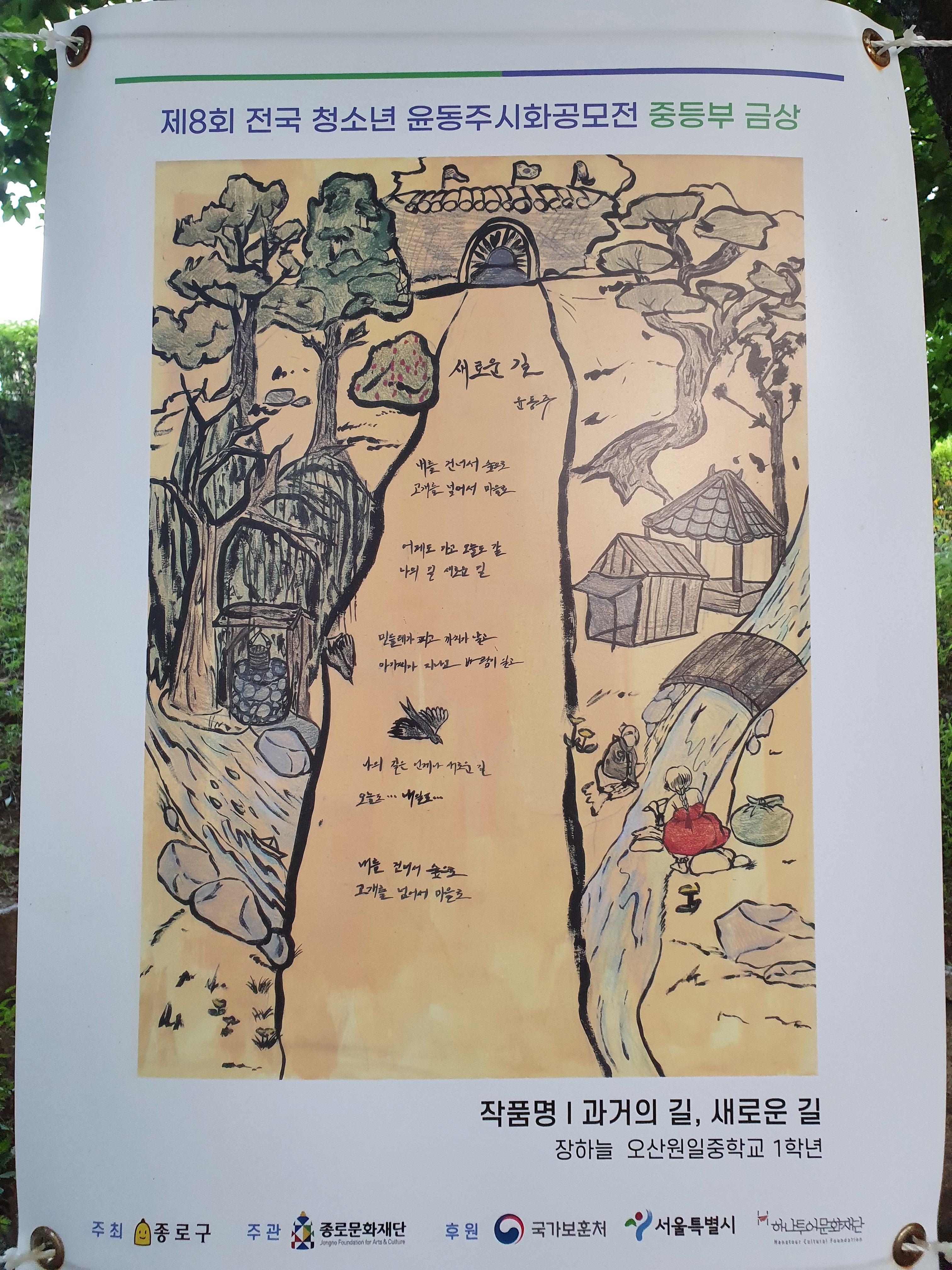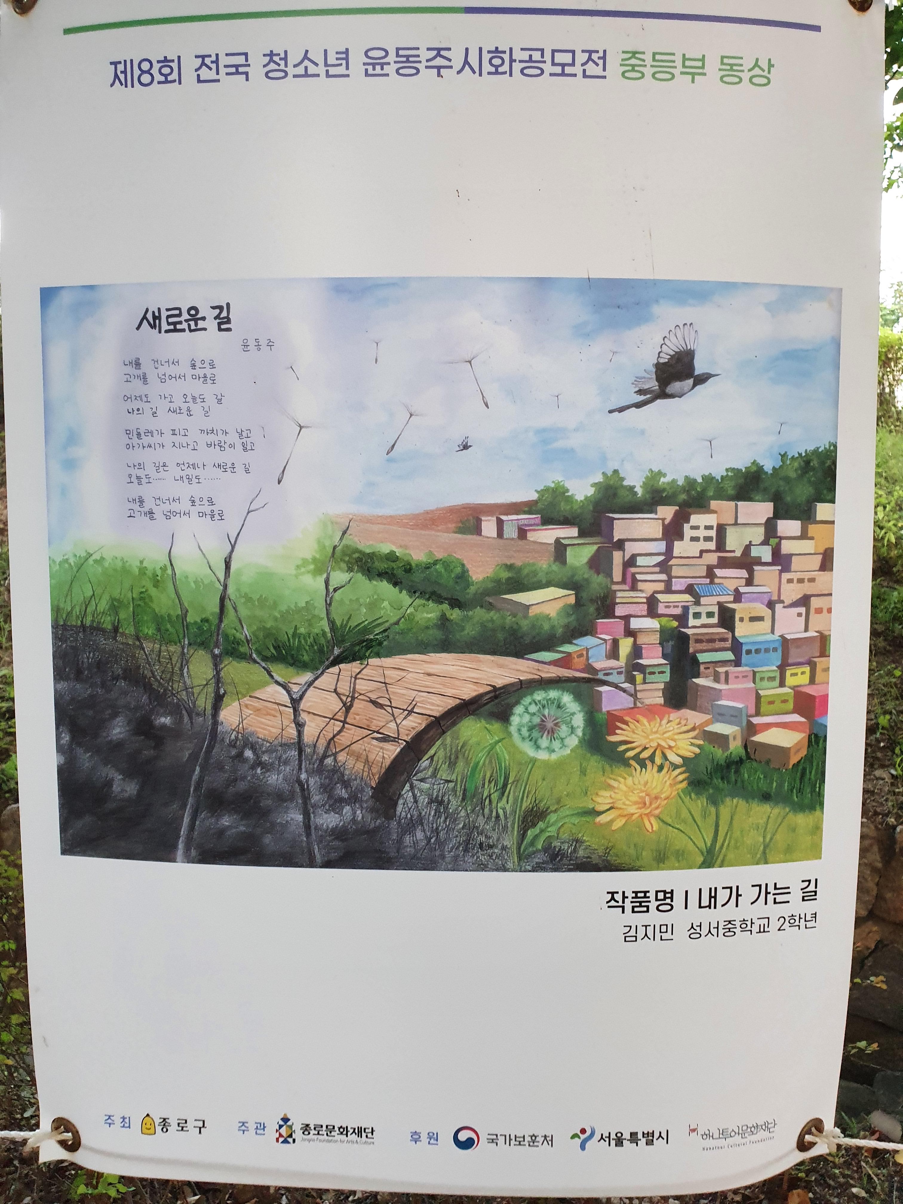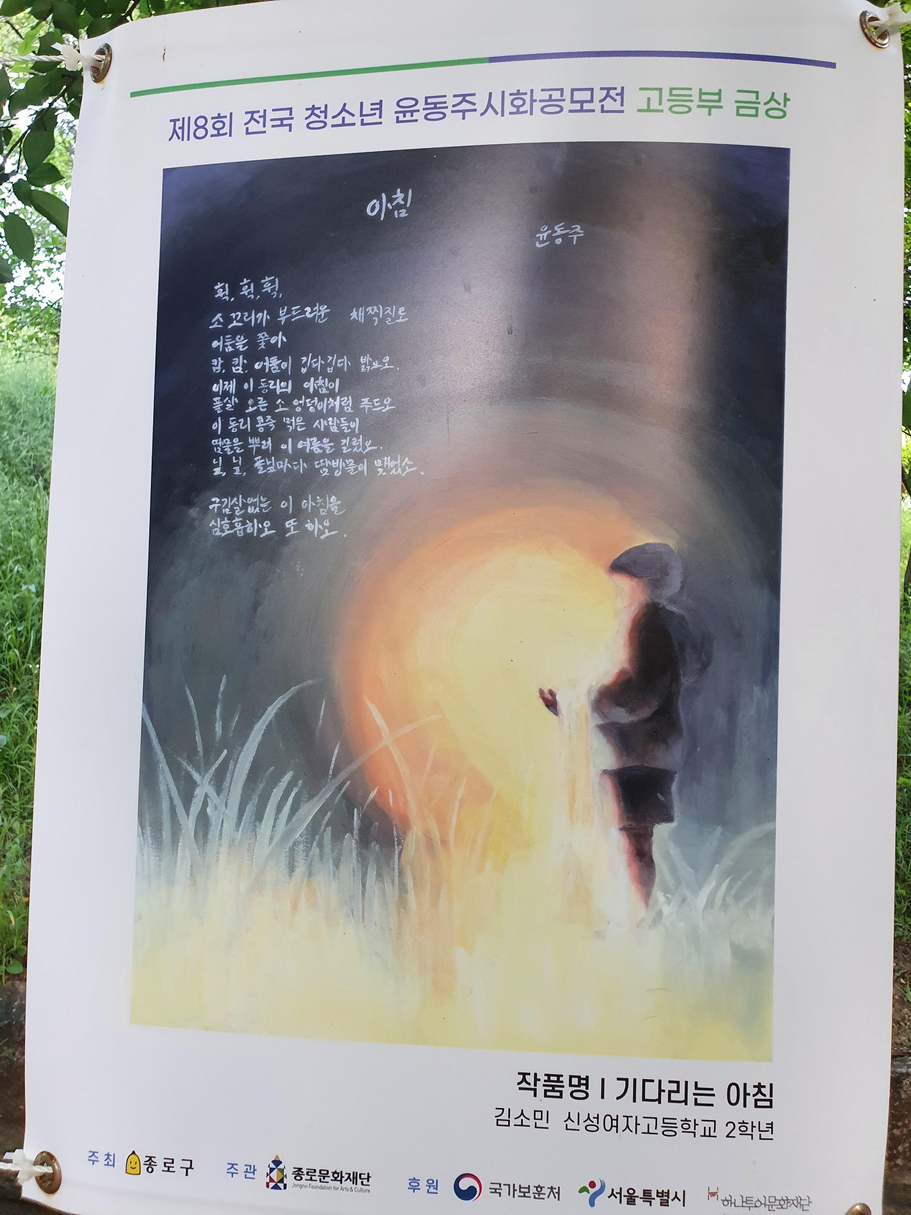 지난 6월 30일부터 8월 15일까지 종로구 부암동 시인의 언덕에서 제8회 전국 청소년 윤동주 시화 공모전 수상작 전시회가 열렸습니다.