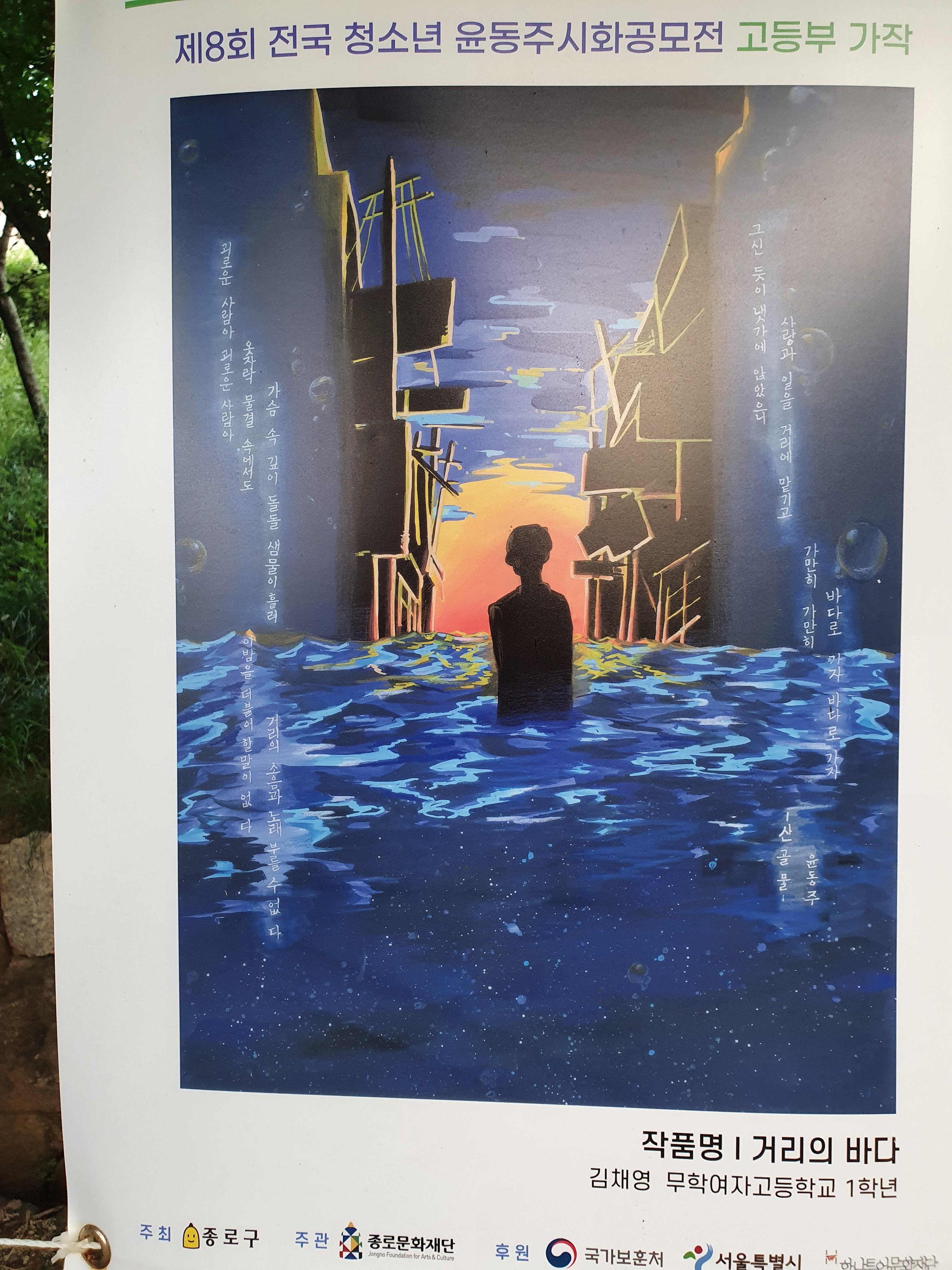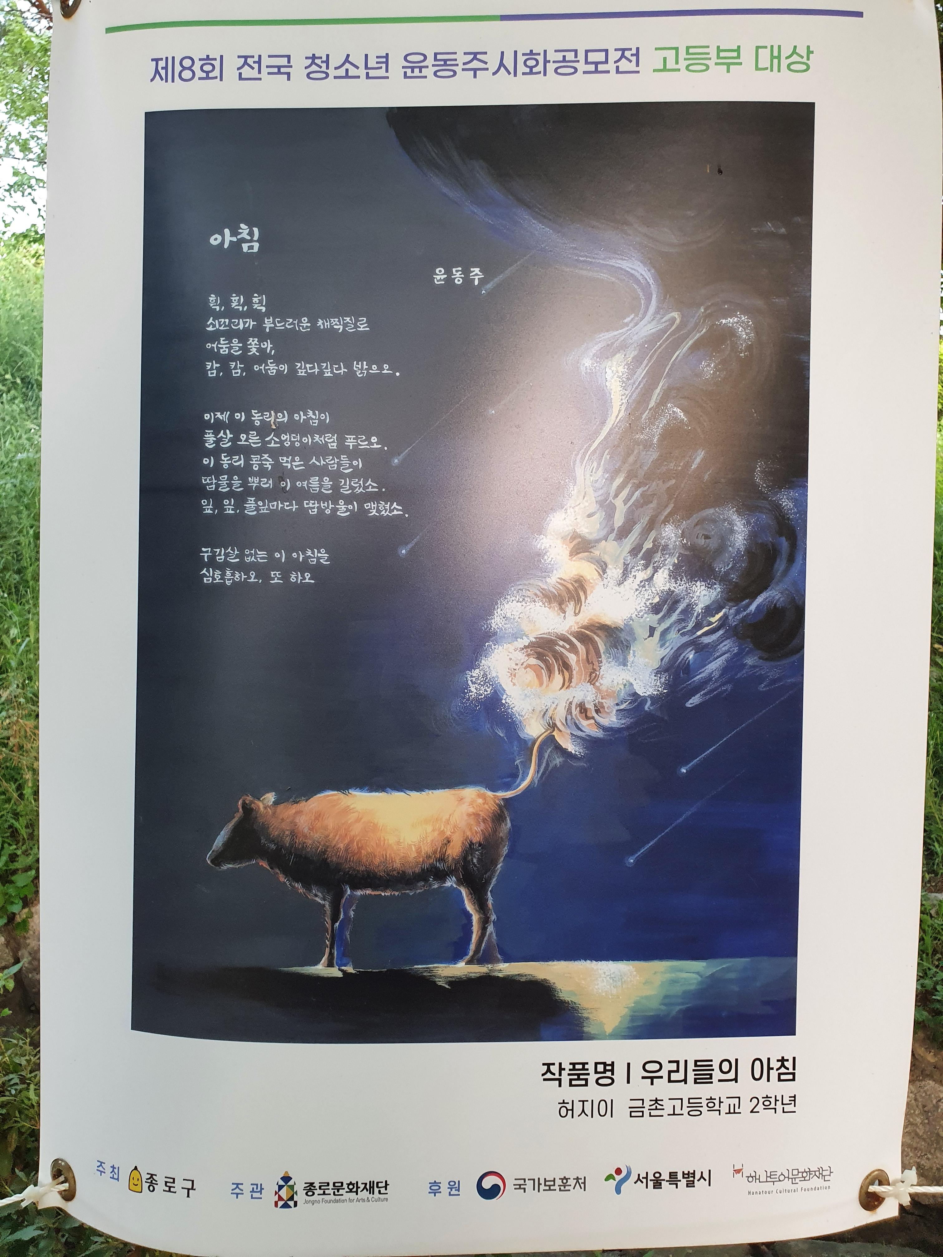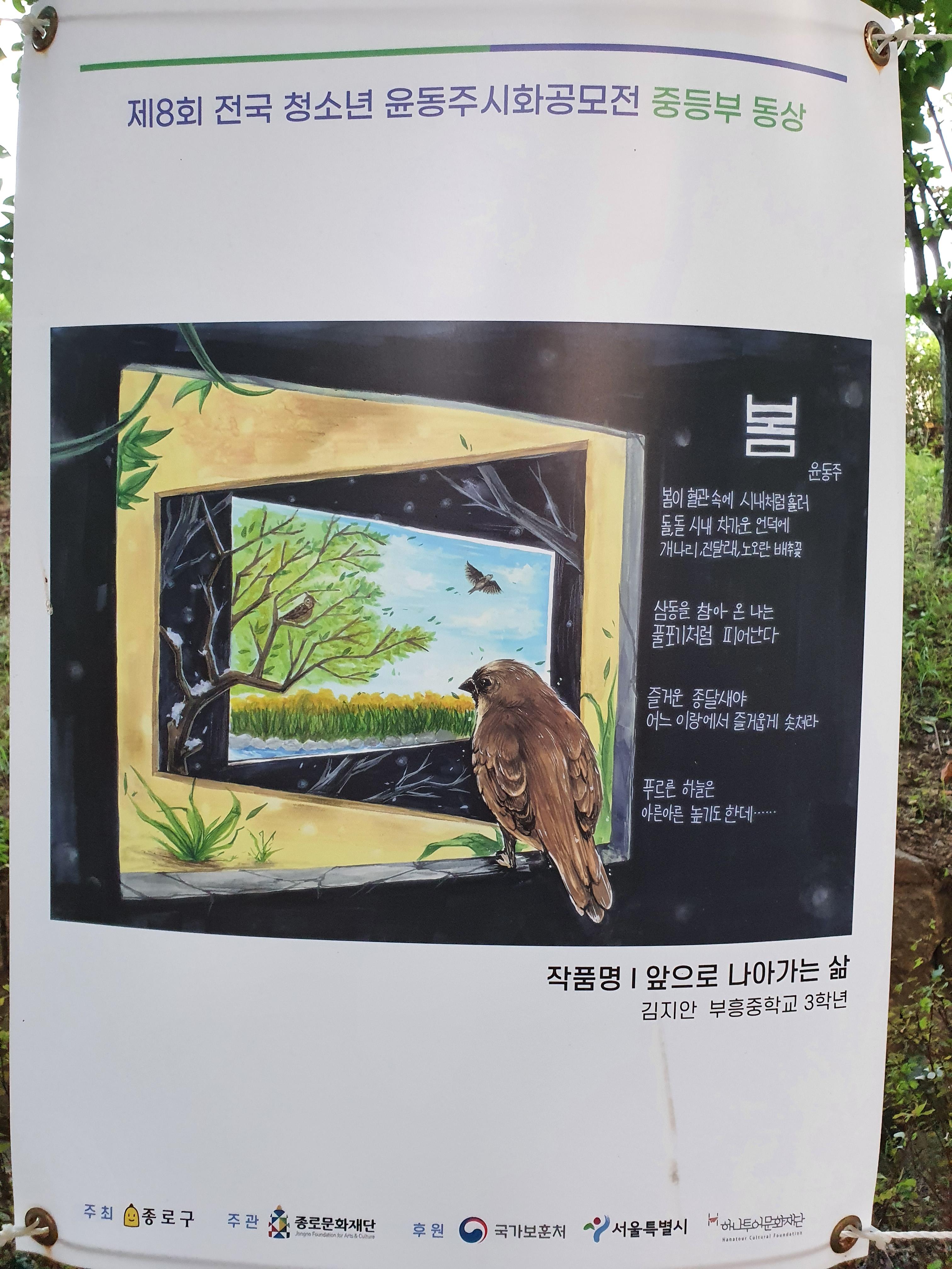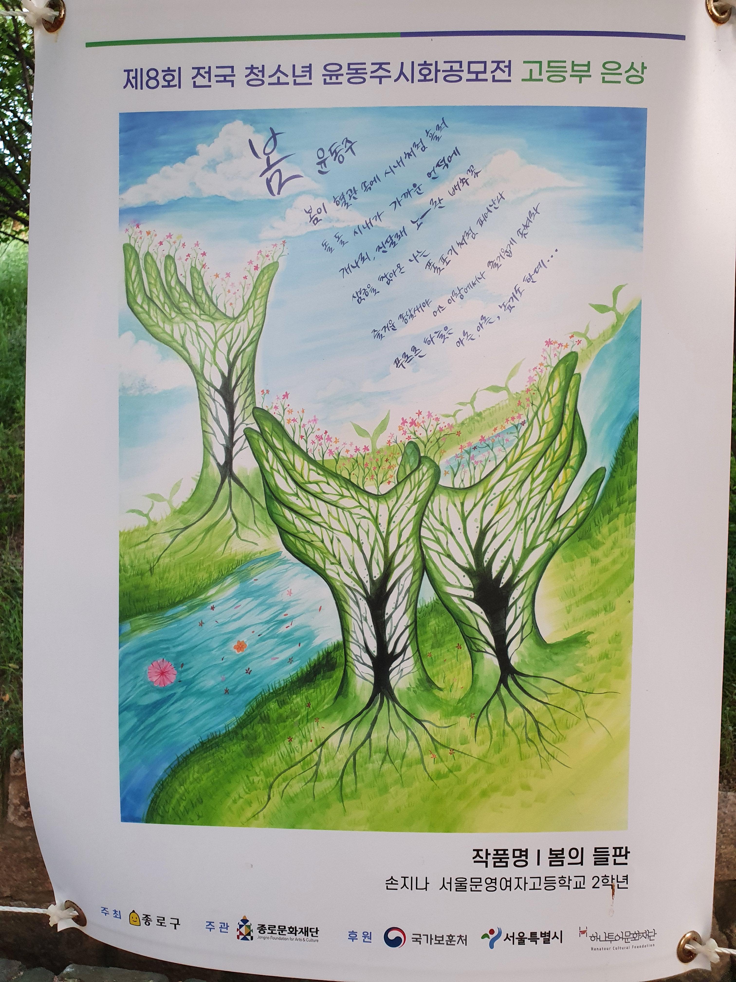 지난 6월 30일부터 8월 15일까지 종로구 부암동 시인의 언덕에서 제8회 전국 청소년 윤동주 시화 공모전 수상작 전시회가 열렸습니다.