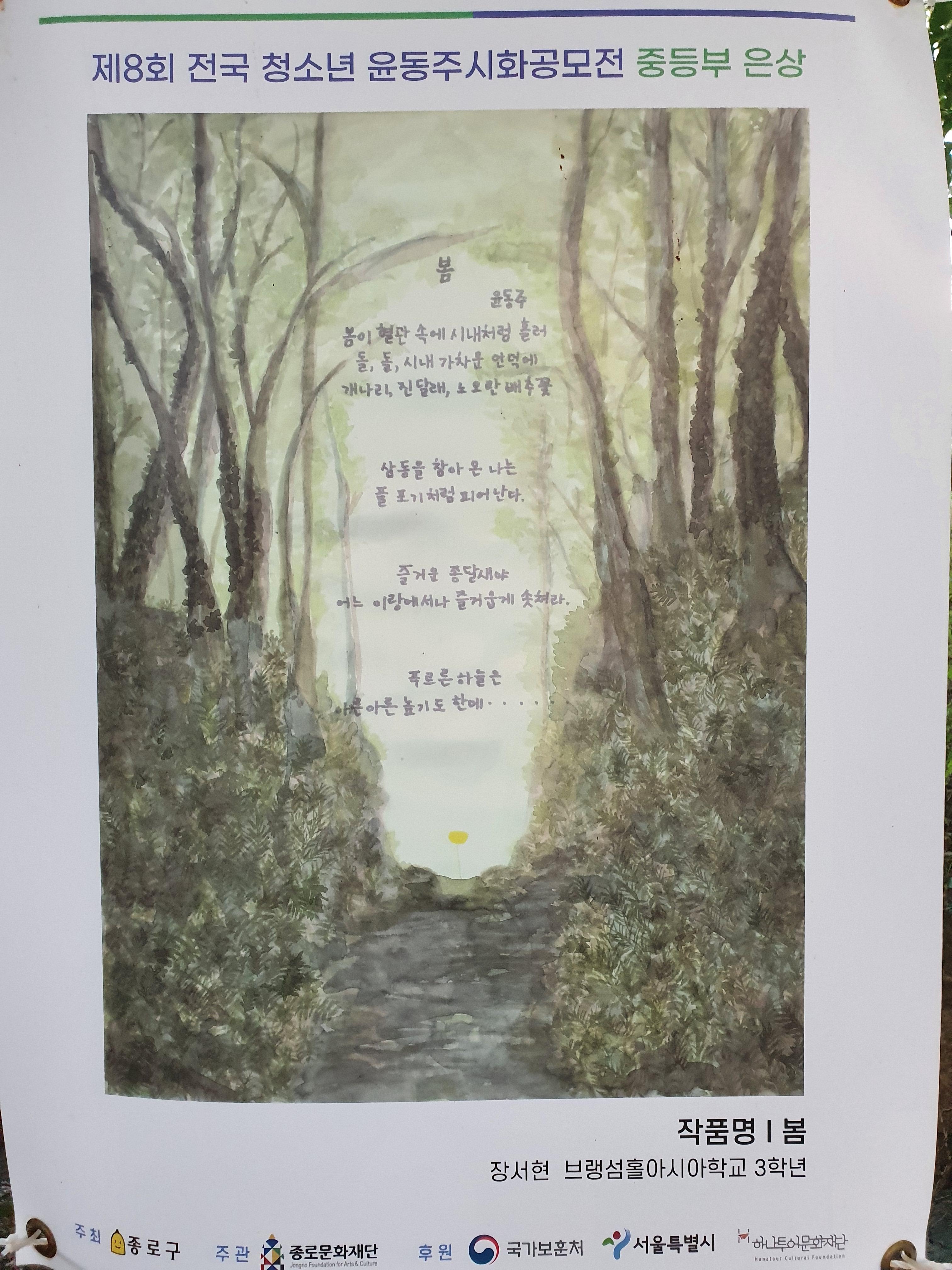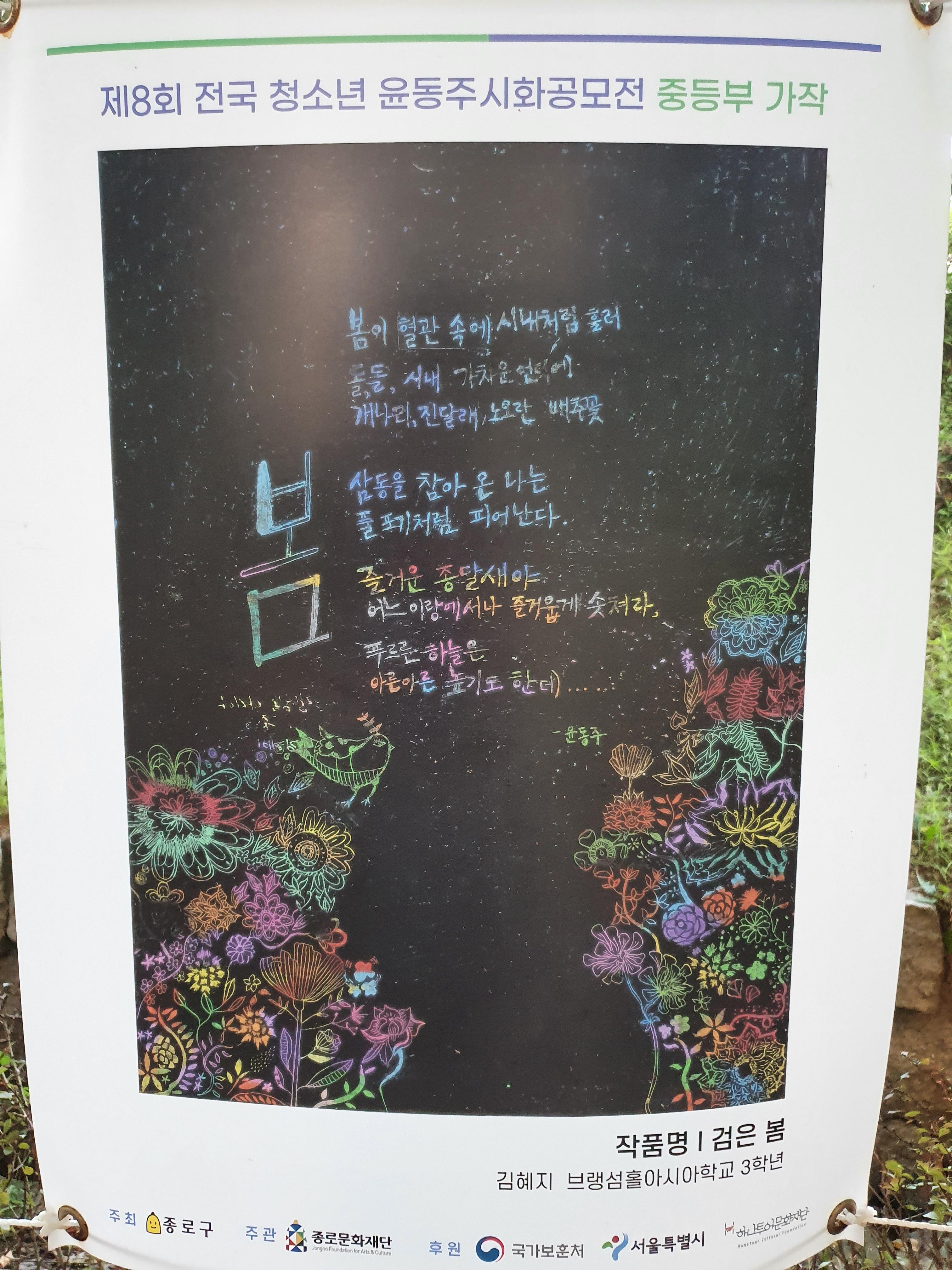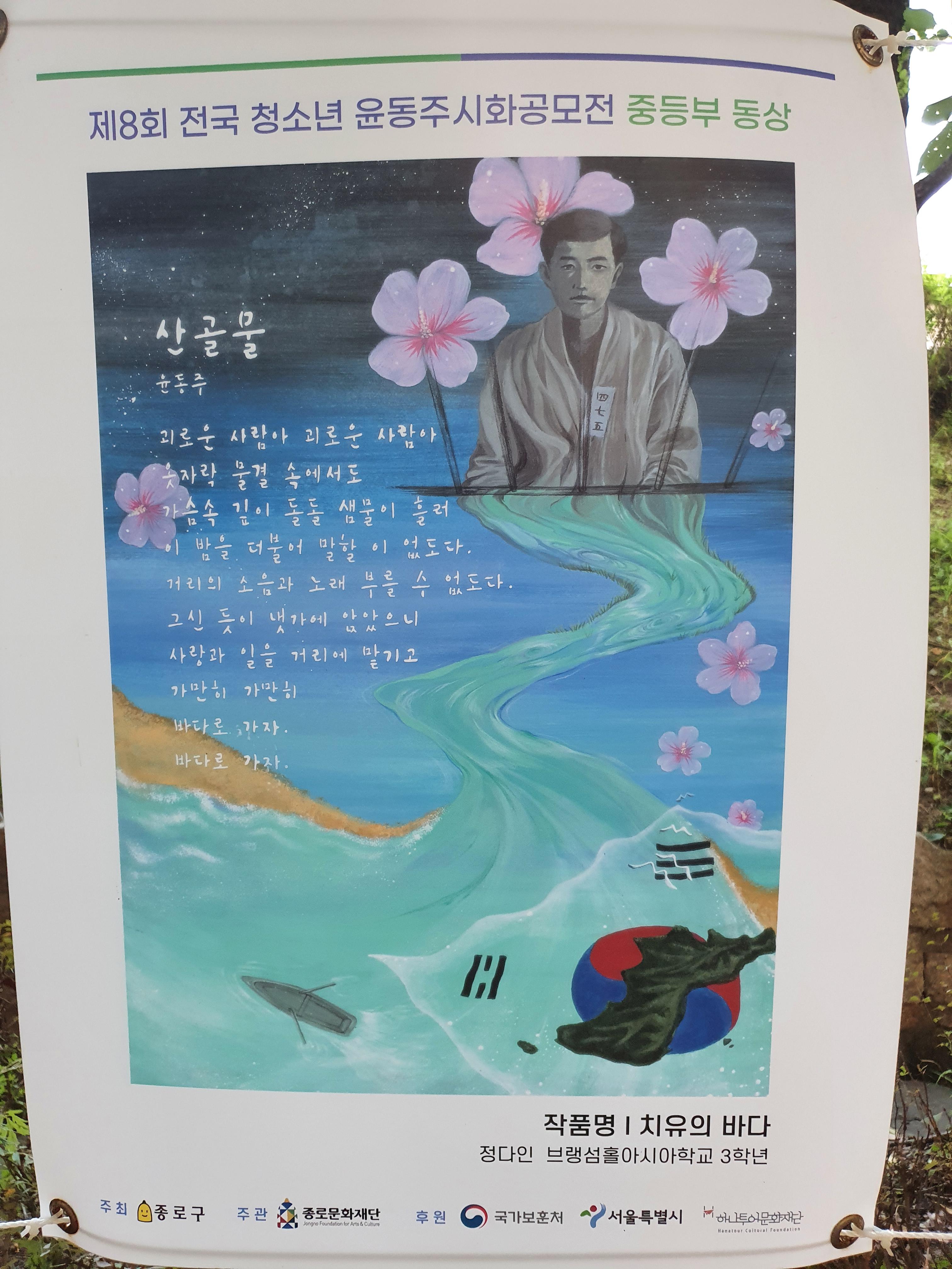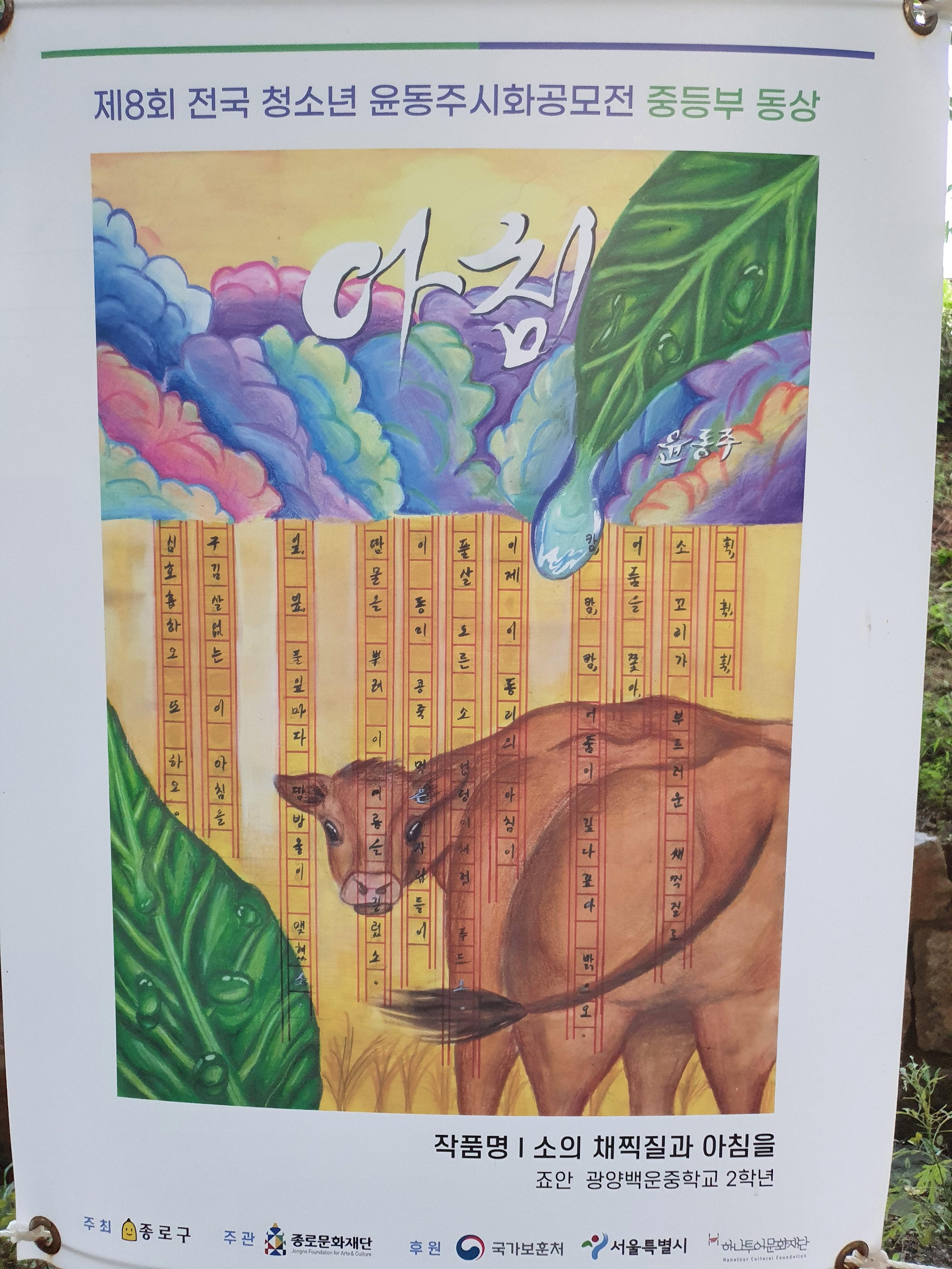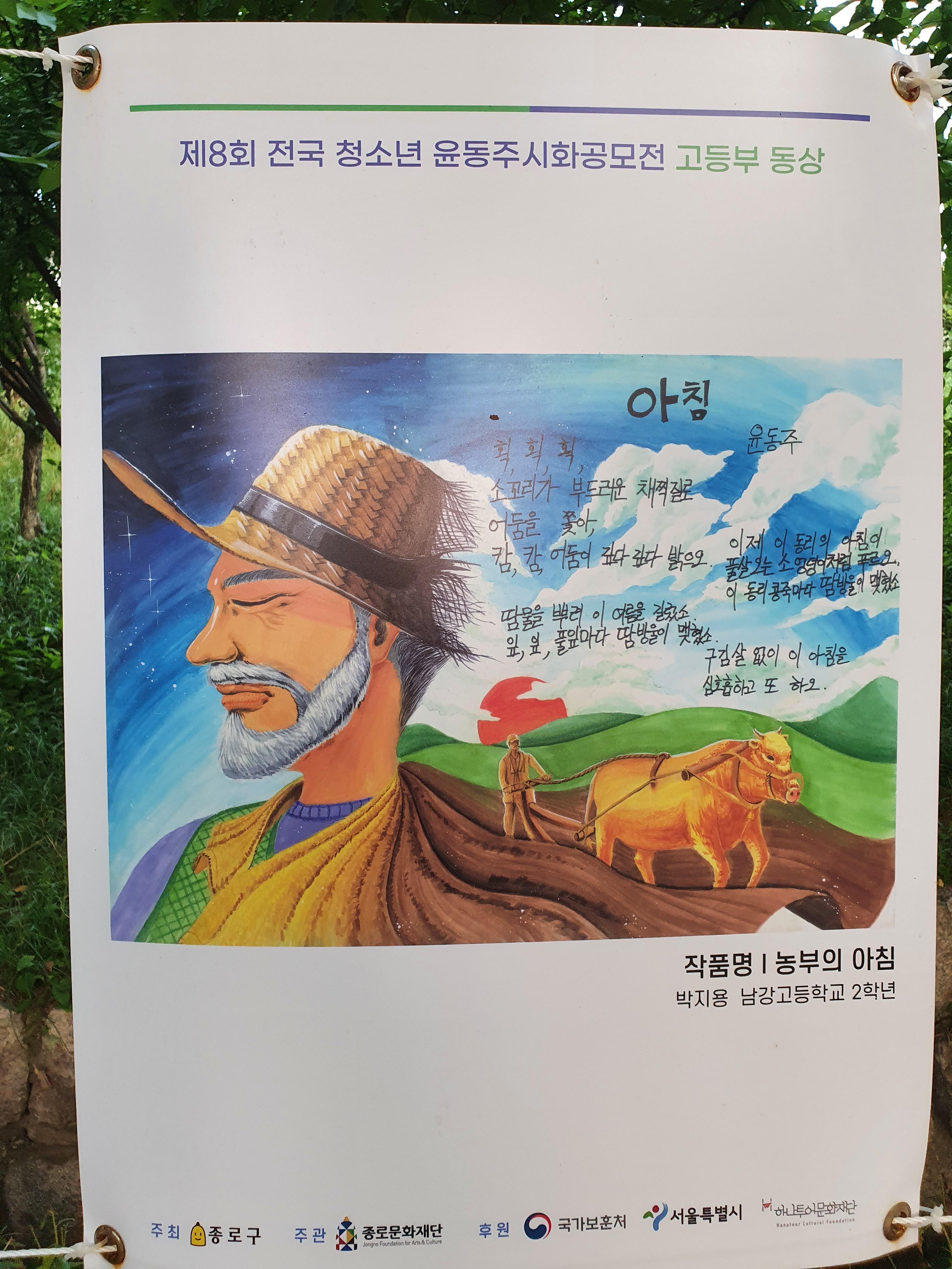 지난 6월 30일부터 8월 15일까지 종로구 부암동 시인의 언덕에서 제8회 전국 청소년 윤동주 시화 공모전 수상작 전시회가 열렸습니다.