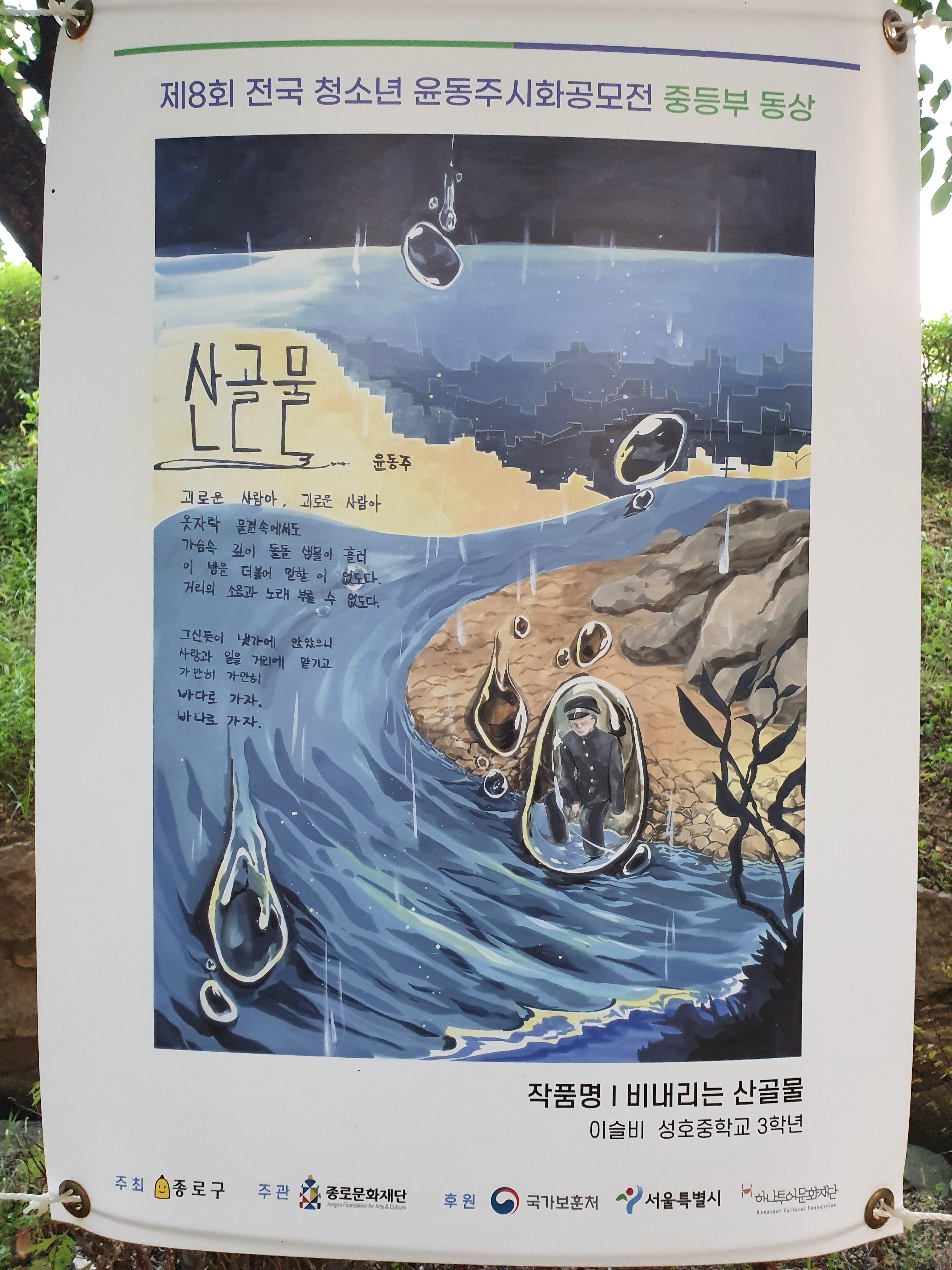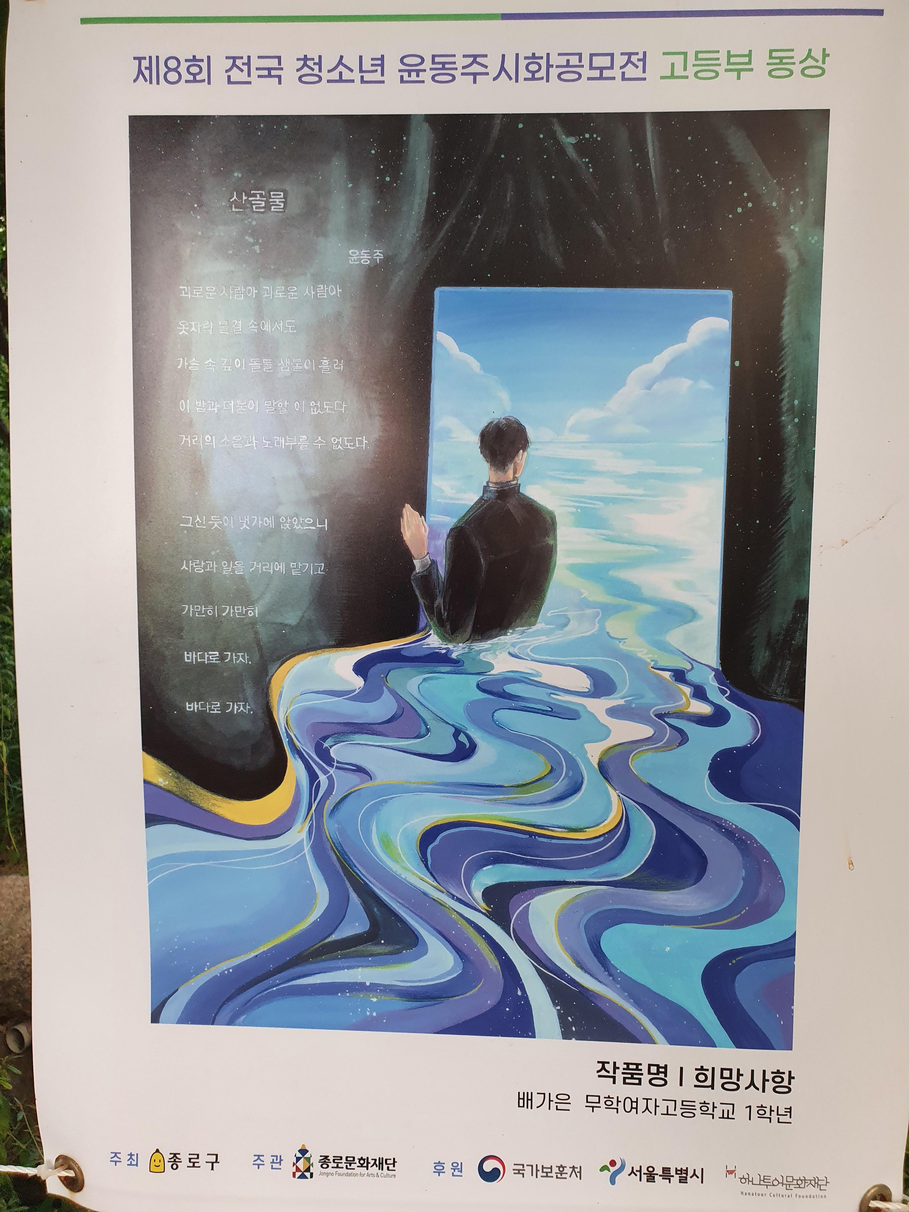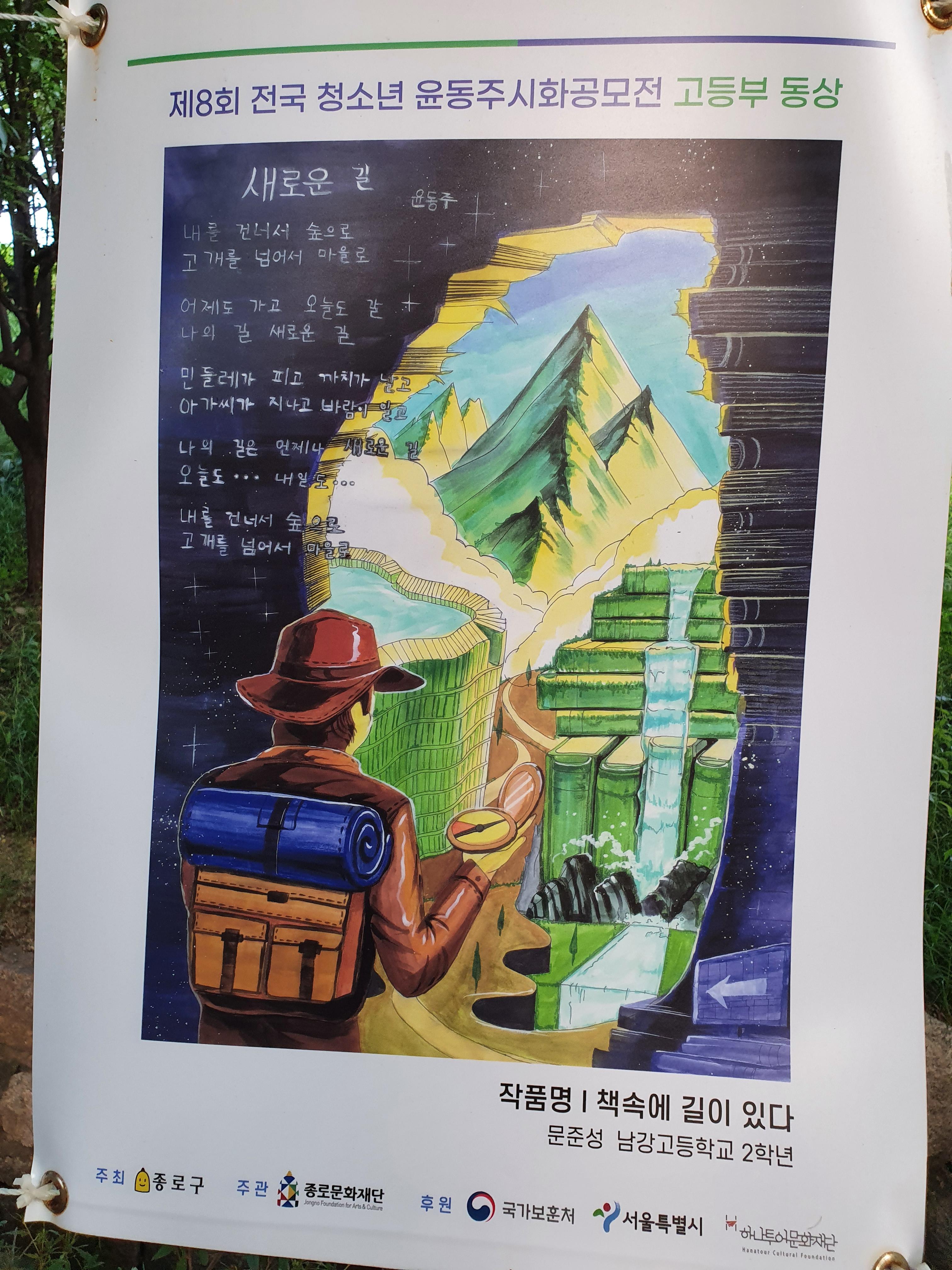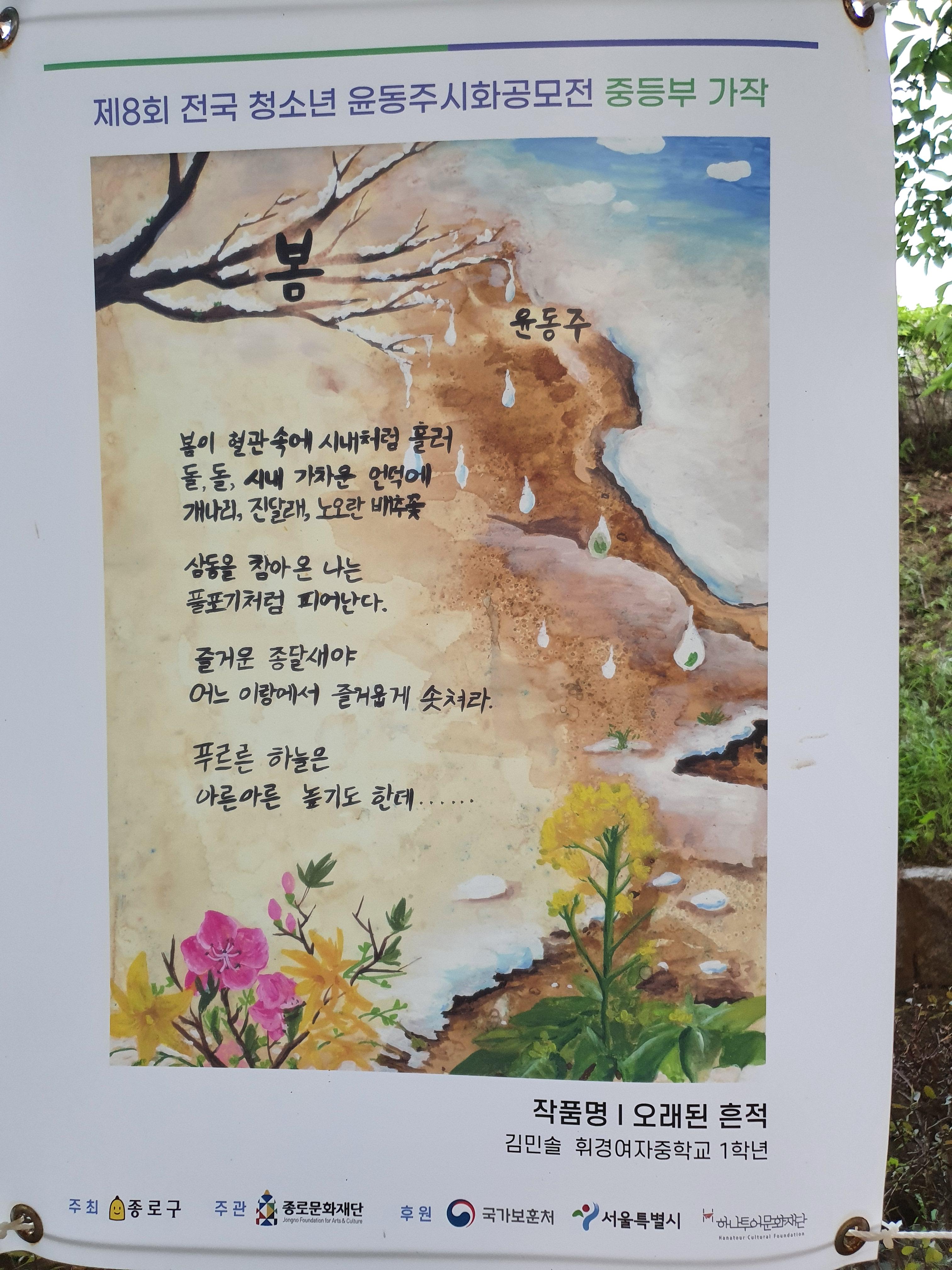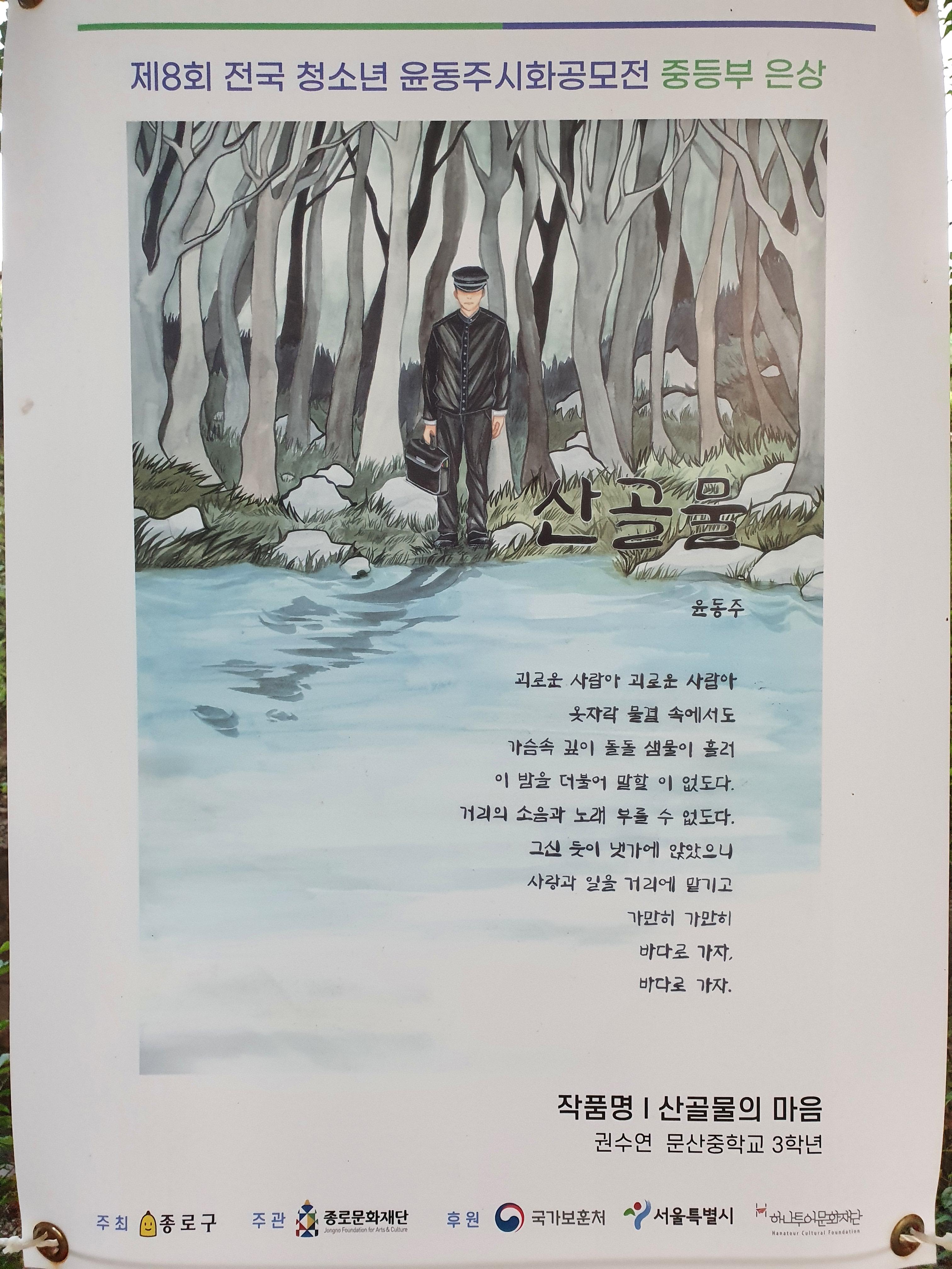 지난 6월 30일부터 8월 15일까지 종로구 부암동 시인의 언덕에서 제8회 전국 청소년 윤동주 시화 공모전 수상작 전시회가 열렸습니다.