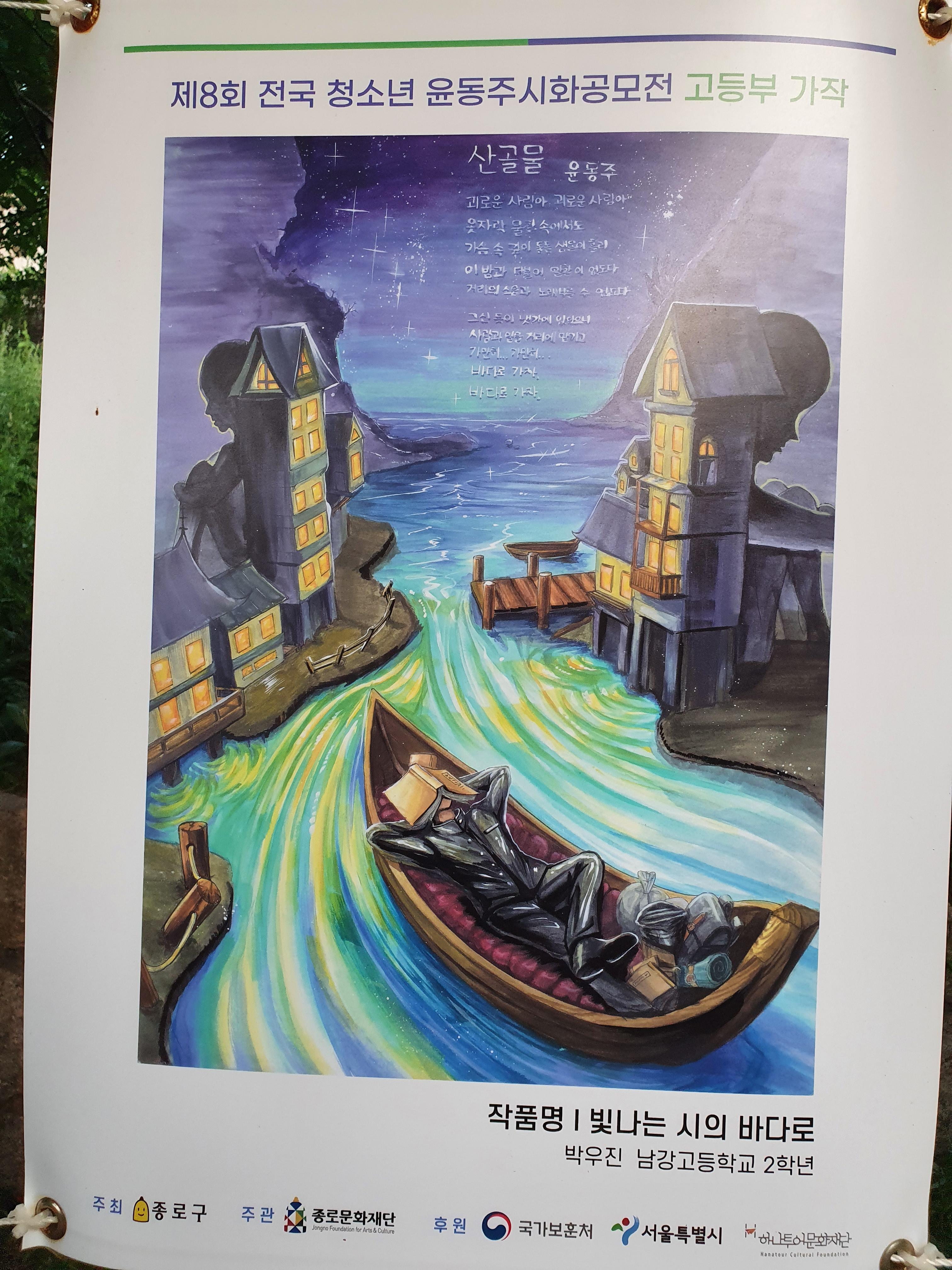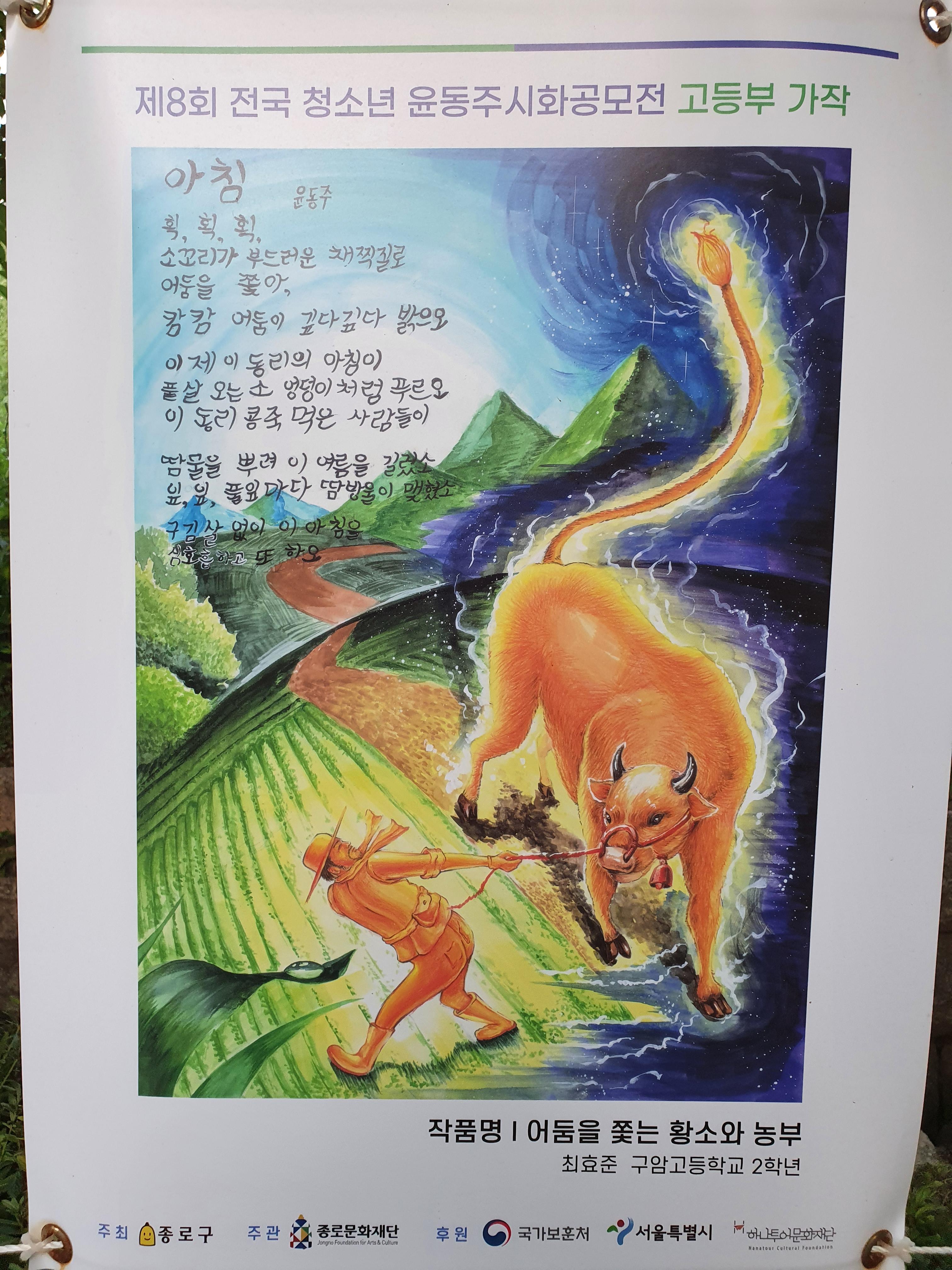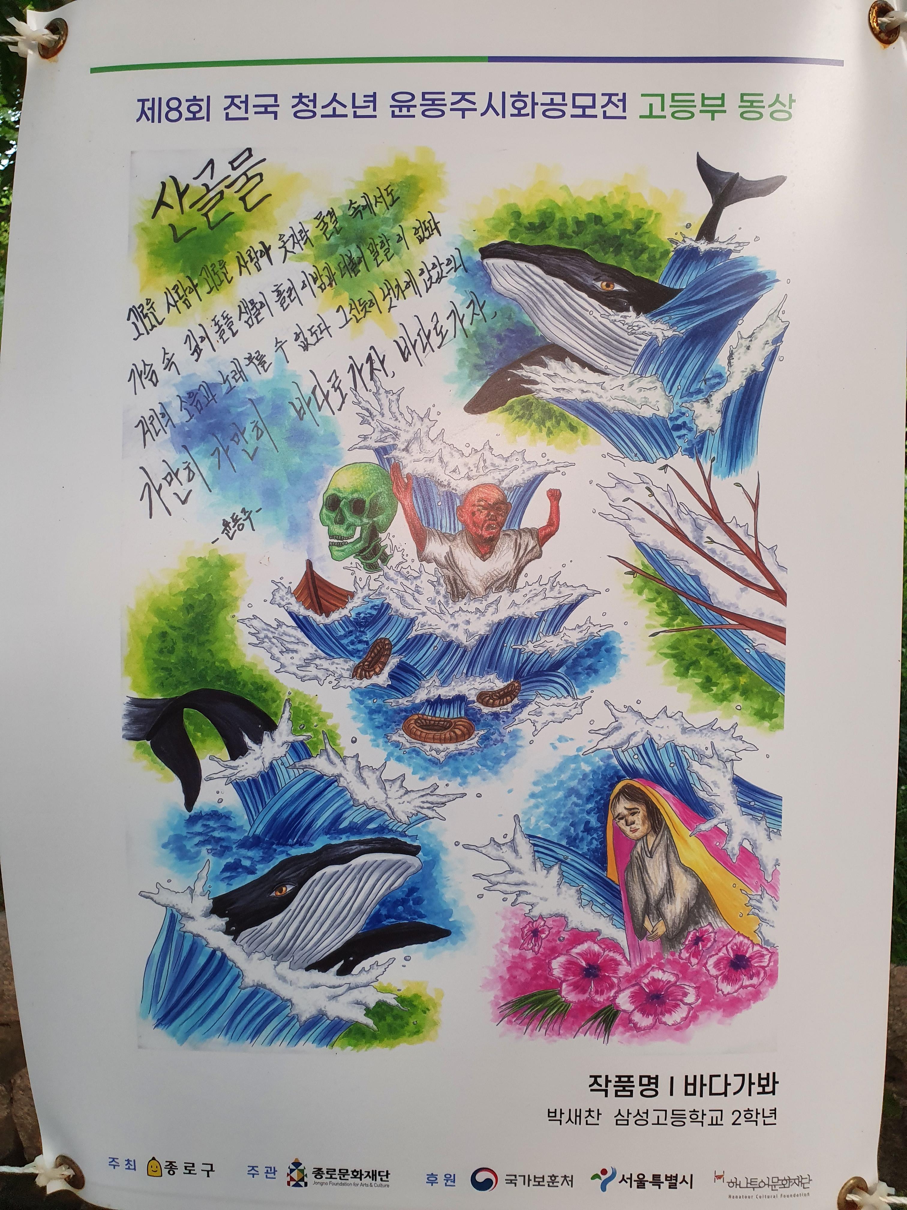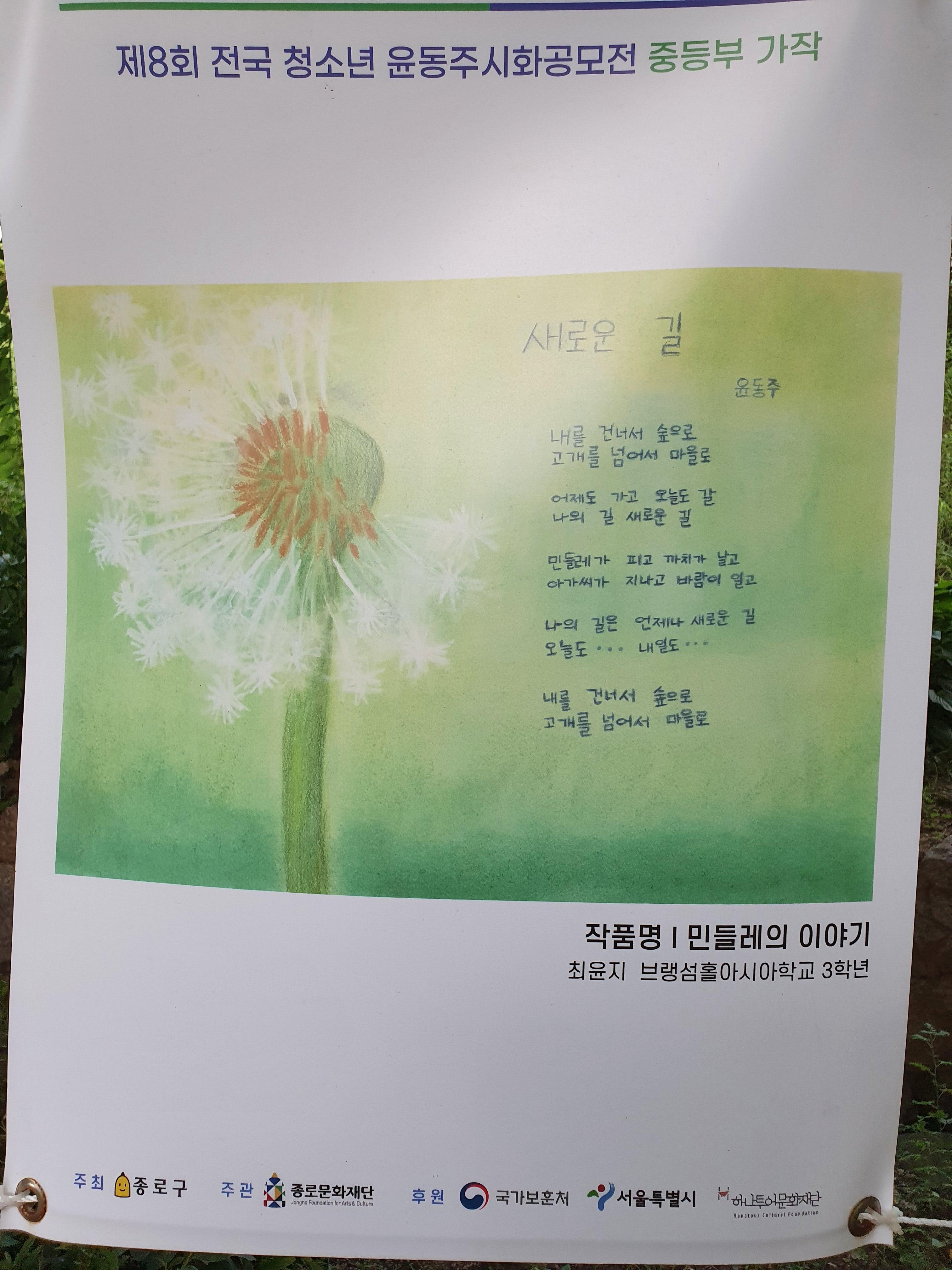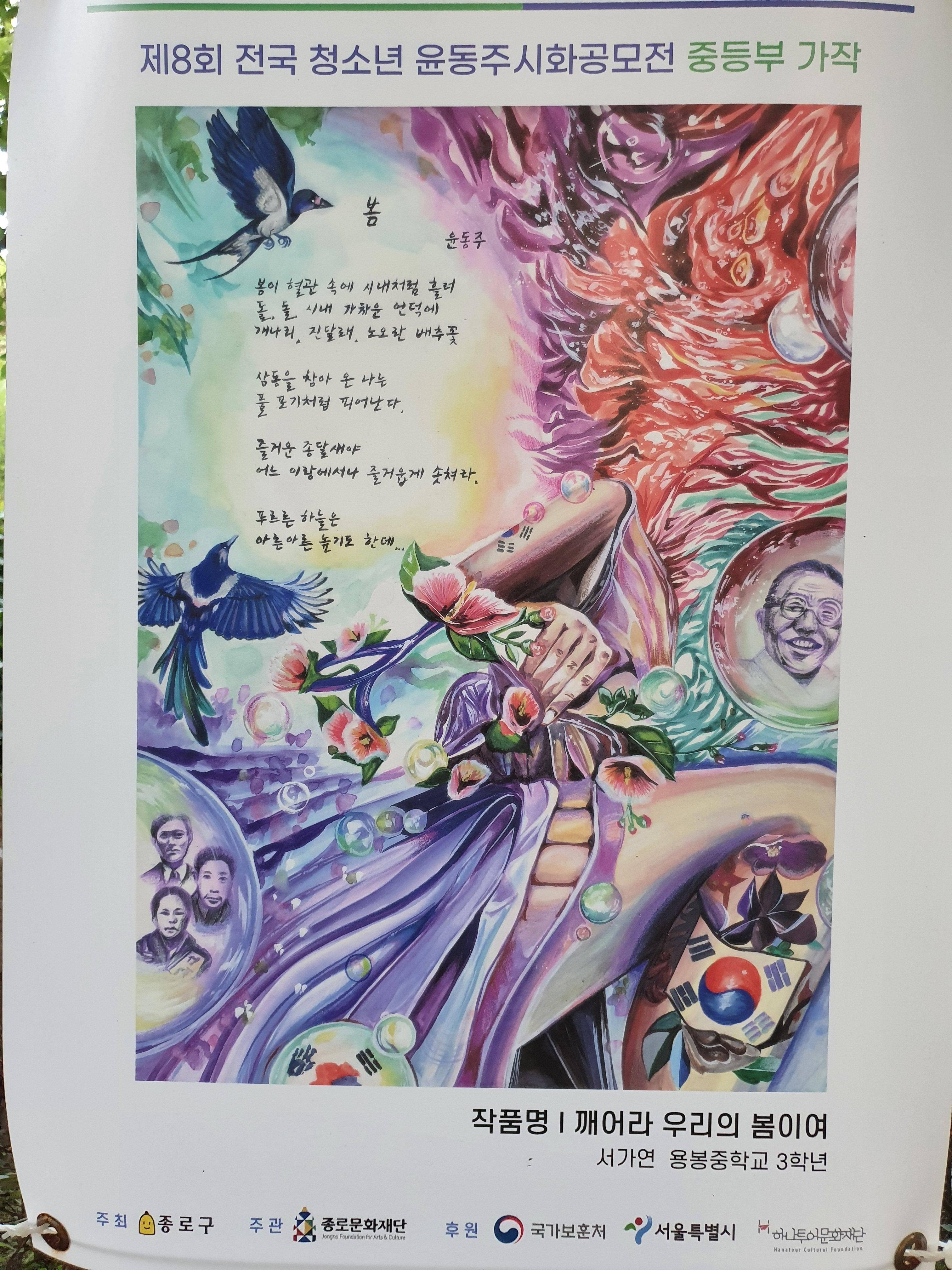 지난 6월 30일부터 8월 15일까지 종로구 부암동 시인의 언덕에서 제8회 전국 청소년 윤동주 시화 공모전 수상작 전시회가 열렸습니다.