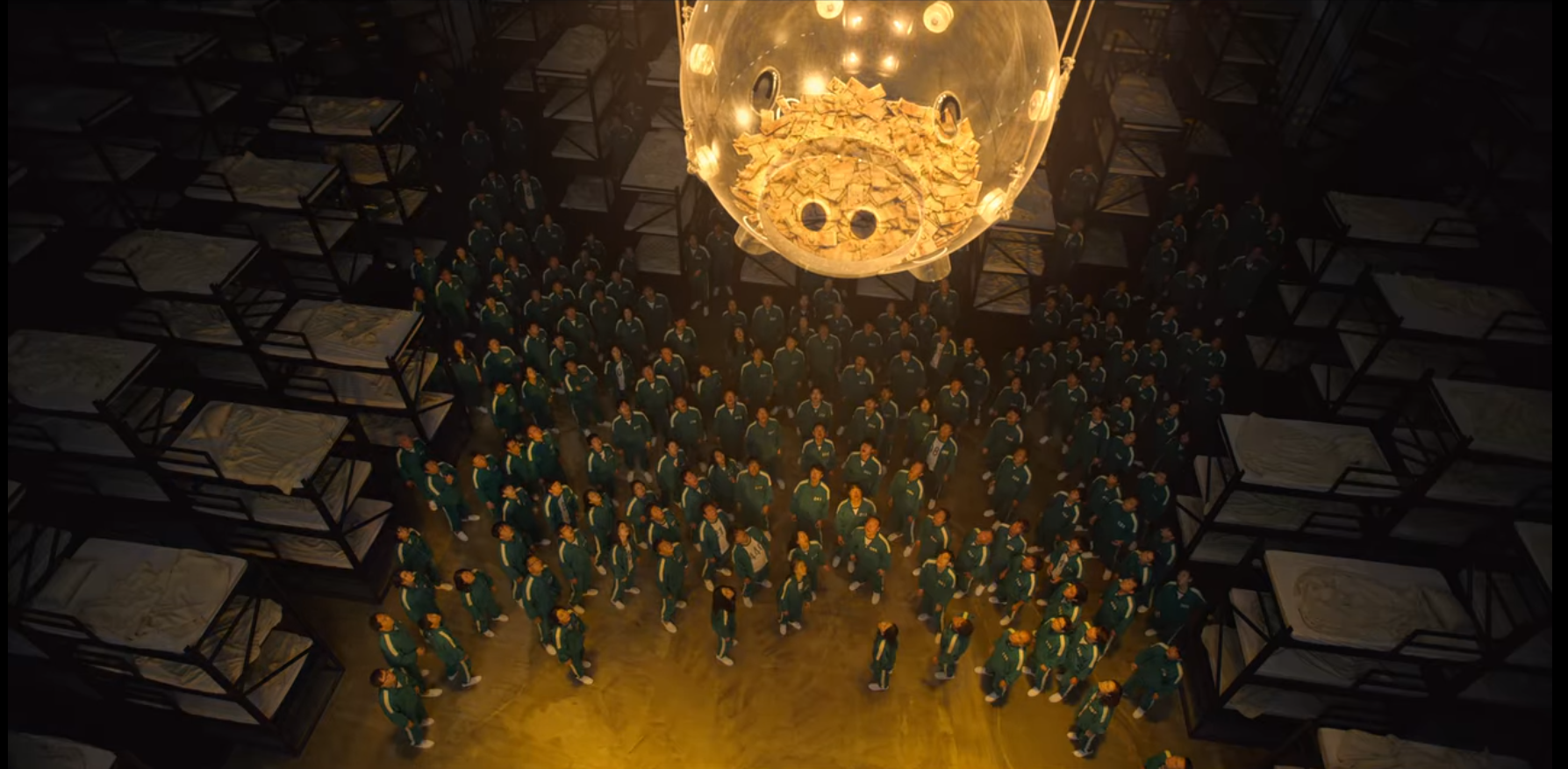 기훈이 정신을 차려보니 커다란 강당 안에서 침대에 누워있는 자신을 발견한다. 옷은 초록색 트레이닝복으로 갈아입혀져 있고 가슴에는 456이라고 새겨진 번호표가 붙어있다. 강당 안에는 수백 명의 사람들이 자신과 같은 모습을 하고 있다. 강당 벽에 붙어 있는 커다란 전광판에는 '참가인원 456명'이라고 적혀 있다.